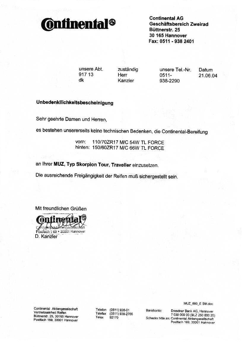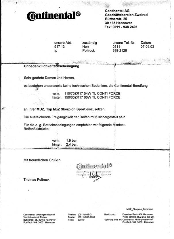Günter Zoller ( E-Mail: guenterzoller@freenet.de ) und Josef Gaul ( E-Mail: musikus@addcom.de ) haben uns die aktuelle Reifenfreigabe für die Skorpion vom Hersteller Continental zukommen lassen.